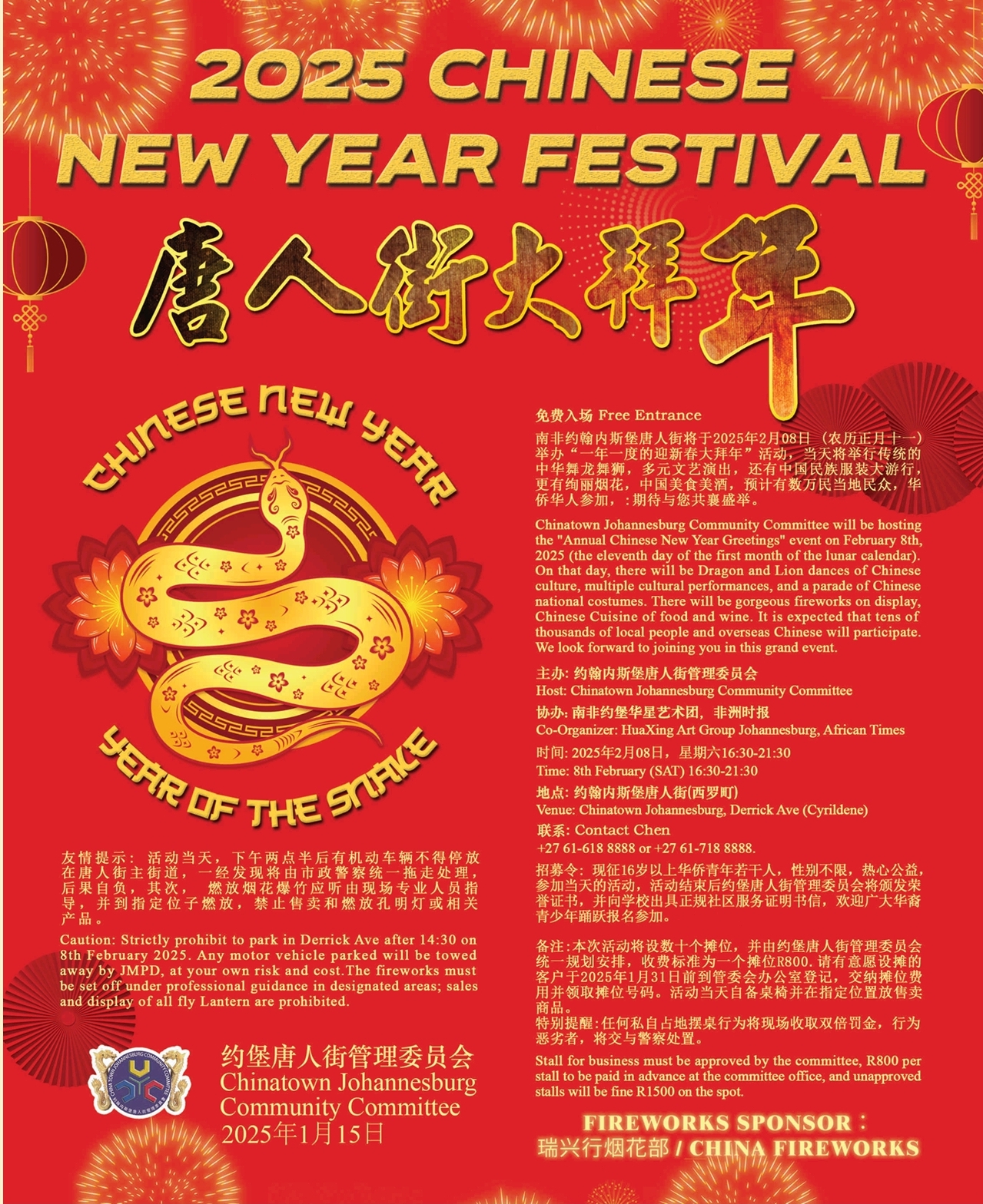 一年一度的约堡唐人街舞龙舞狮大拜年活动即将盛大开启!这是一场汇聚南非华侨华人的春节盛典,让我们在欢声笑语中,共同迎接蛇年的到来。